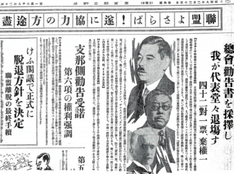 « La carrière de Nitobe Inazō prend fin au moment où le Japon se trouve confronté à la double montée de l’antiparlementarisme et de l’ultranationalisme qui se propagent à partir de 1932, exacerbés par la publication du rapport Lytton (リットン報告書, Ritton Hōkokusho), condamnation de la politique du Japon en Mandchourie qui conduit le Japon, dès cette année 1933, à annoncer sa décision de quitter la SDN[18], époque à partir de laquelle les partisans de l’internationalisme deviennent politiquement inaudibles. »[Notes 1]